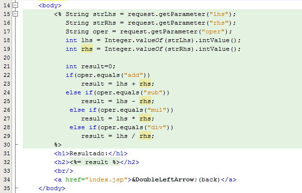 What the code above is doing is receiving (GET) the parameters sent to the server when submitting the form, in index.jsp, through parameters sent via the URL (request.getParameter(...)); convert the values that we need into numeric integer values (int), (Integer.valueOf(...).intValue()); and, then, make the computations, depending on the previously selected operator, which is passed to newjsp.jsp with the key "oper".